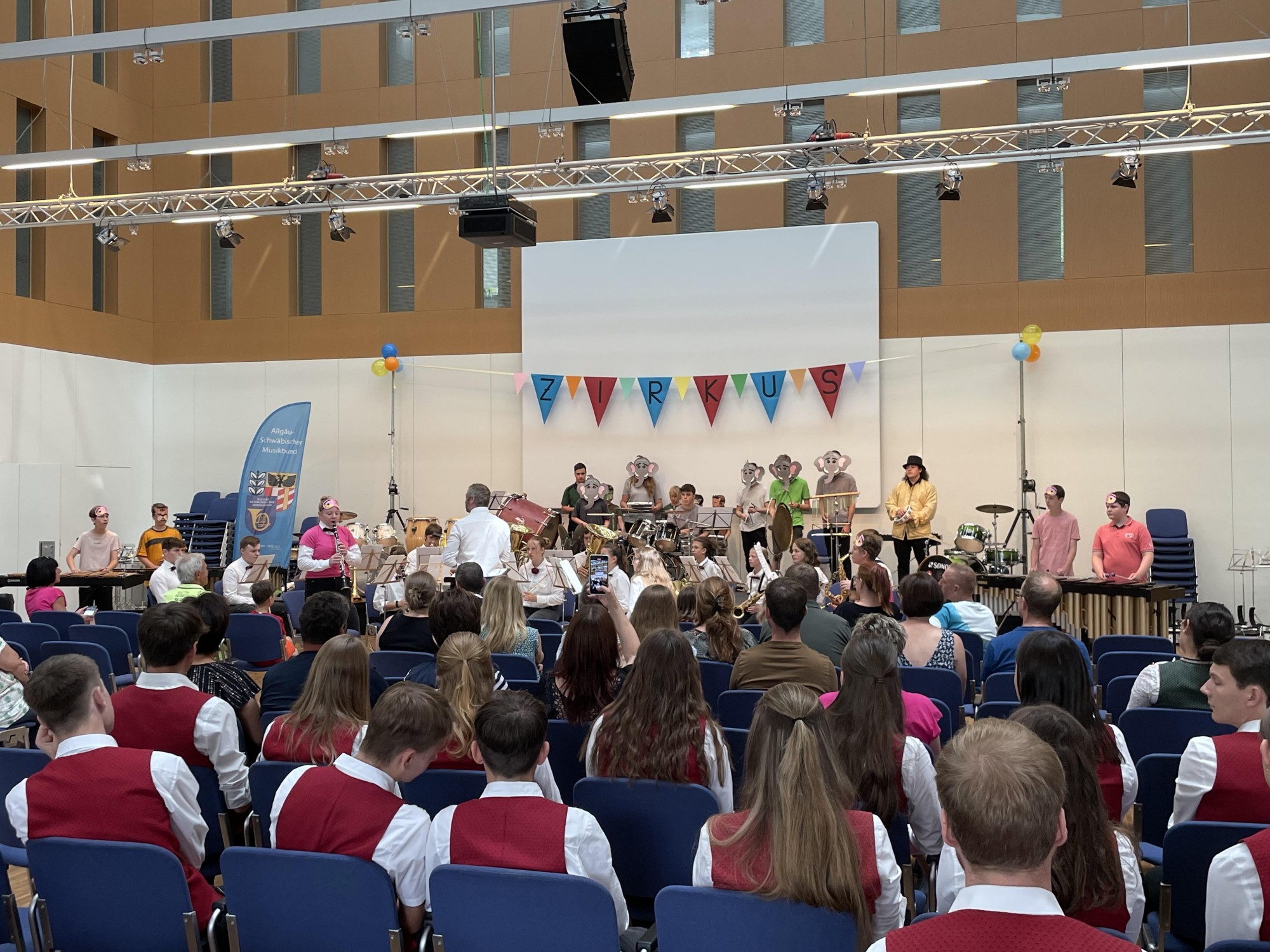 Entsprechend schwer hatten es die Juroren. Mit Michaela Klahr (Landesjugendleiterin des Bayerischen Blasmusikverbands), Marina Beer (ASM-Jurorin), ASM-Verbandsdirigent Thomas Hartmann und Heiko Kübler (aktiver Musiker und stv. Geschäftsbereichsleitung Bildung der HWK) war eine hochkarätige Jury mit der Bewertung der Vorträge betraut. Sie hatte die anspruchsvolle Aufgabe, die Vorträge der Kapellen in eine faire Rangliste zu bringen. Das gelang bestens: Den Sieg in der Altersgruppe 2 (Altersgruppe 1 war nicht besetzt) trug die Jugendblaskapelle Reutti/Holzschwang mit 95 von 100 Punkten davon, in der Altersgruppe 3 belegte das Jugendblasorchester der Musikschule Grundremmingen, Offingen, Rettenbach den 1. Platz, ebenfalls mit 95 von 100 möglichen Punkten. Den Sonderpreis vergab die Jury an das Jugendensemble Langerringen: Die jungen Musikerinnen und Musiker hatten unter dem Motto „Zirkus Rambazamba“ eine ausgefeilte Choreografie präsentiert und haben sich damit einen Auftritt bei der Meisterfeier der Handwerkskammer am Jahresende erspielt.