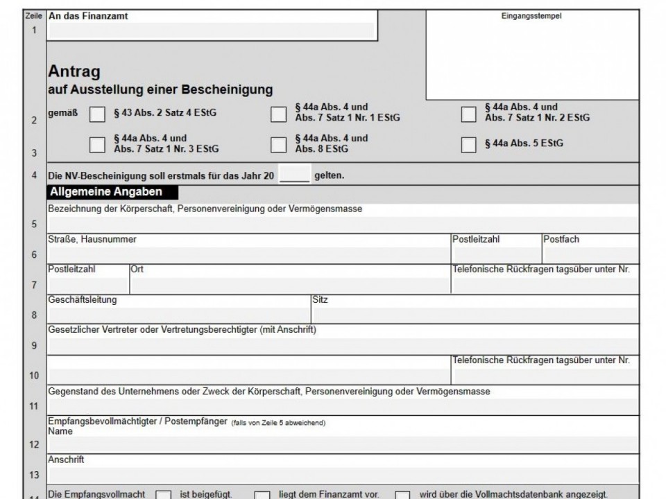 Der Verein kann dem Kreditinstitut eine NV-Bescheinigung vorlegen, die auf Antrag des Vereins vom Finanzamt ausgestellt wird. Erforderlich ist für gemeinnützige Vereine die NV-Bescheinigung „NV 2 B“. Der Antrag wird mit dem Vordruck „NV 2 A“ gestellt (PDF abrufbar unter https://www.finanzamt.bayern.de/Informationen/Formulare/Weitere_Themen_A_bis_Z/Nichtveranlagungsbescheinigungen/). Die Bescheinigung wird unter dem Vorbehalt des Widerrufs ausgestellt, ihre Geltungsdauer beträgt höchstens drei Jahre und endet am Schluss eines Kalenderjahres (z.B. ist eine im November 2021 ausgestellte Bescheinigung bis Ende 2023 gültig).