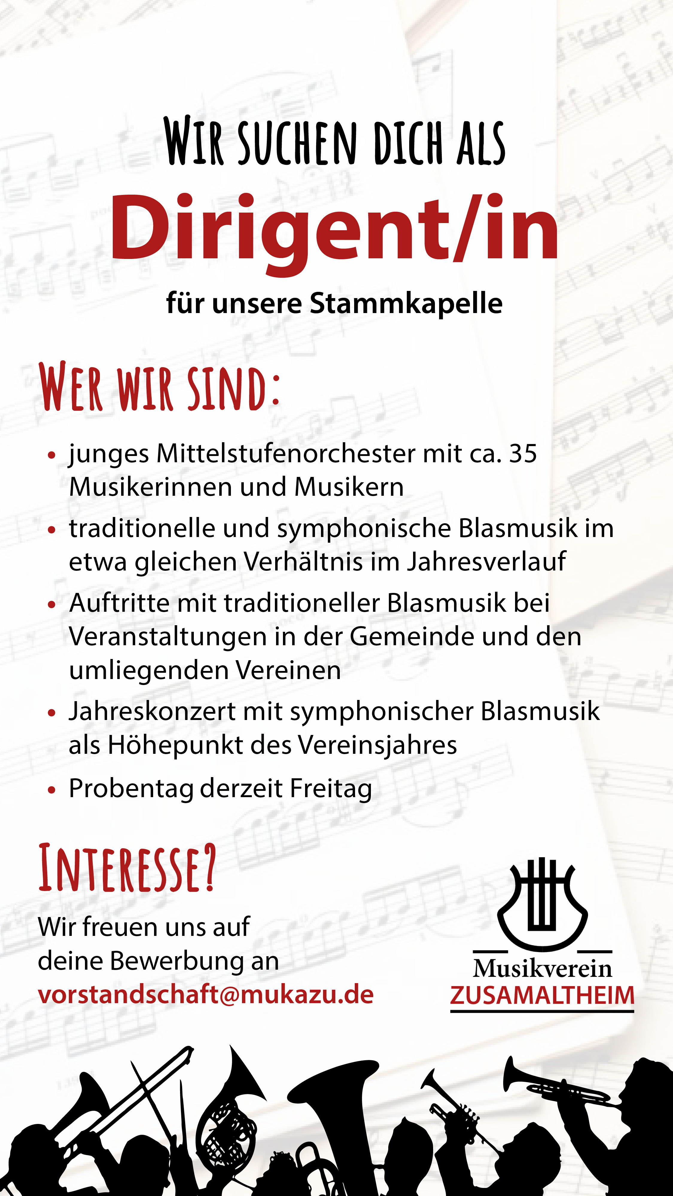 Wer wir sind: - junges Mittelstufenorchester mit ca. 35 Musikerinnen und Musikern - bunte Mischung aus traditioneller und symphonischer Blasmusik im Jahresverlauf Auftritte mit traditioneller Blasmusik bei Veranstaltungen in der Gemeinde und den umliegenden Vereinen - Jahreskonzert mit symphonischer Blasmusik als Höhepunkt des Vereinsjahres - Probentag derzeit Freitag - moderne, akustisch ausgebaute Probenräume Dein Profil: - Qualifizierte Ausbildung im Bereich Blasorchesterleitung, z. B. Musikstudium oder Dirigentenlehrgang - Musikalische Leitung der Proben und Auftritte mit Begeisterung und Fachkenntnis - Leidenschaft für symphonische und traditionelle Blasmusik - Aufgeschlossenheit gegenüber Musikern aller Altersgruppen - Beteiligung im Vereinsleben - Motivierende und abwechslungsreiche Probenarbeit Wir freuen uns auf Deine Bewerbung und sind sehr gespannt Dich bei einem Probedirigat kennenzulernen!