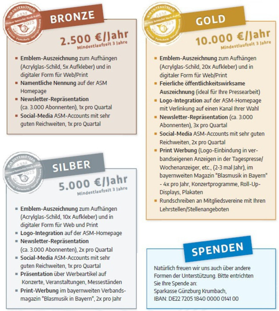 Wir, der Allgäu-Schwäbische Musikbund e.V. (ASM), suchen neue Förderer und Partner, um unserem Auftrag in der Verbandsarbeit für unsere heimischen Musikvereine noch erfolgreicher nachkommen zu können.